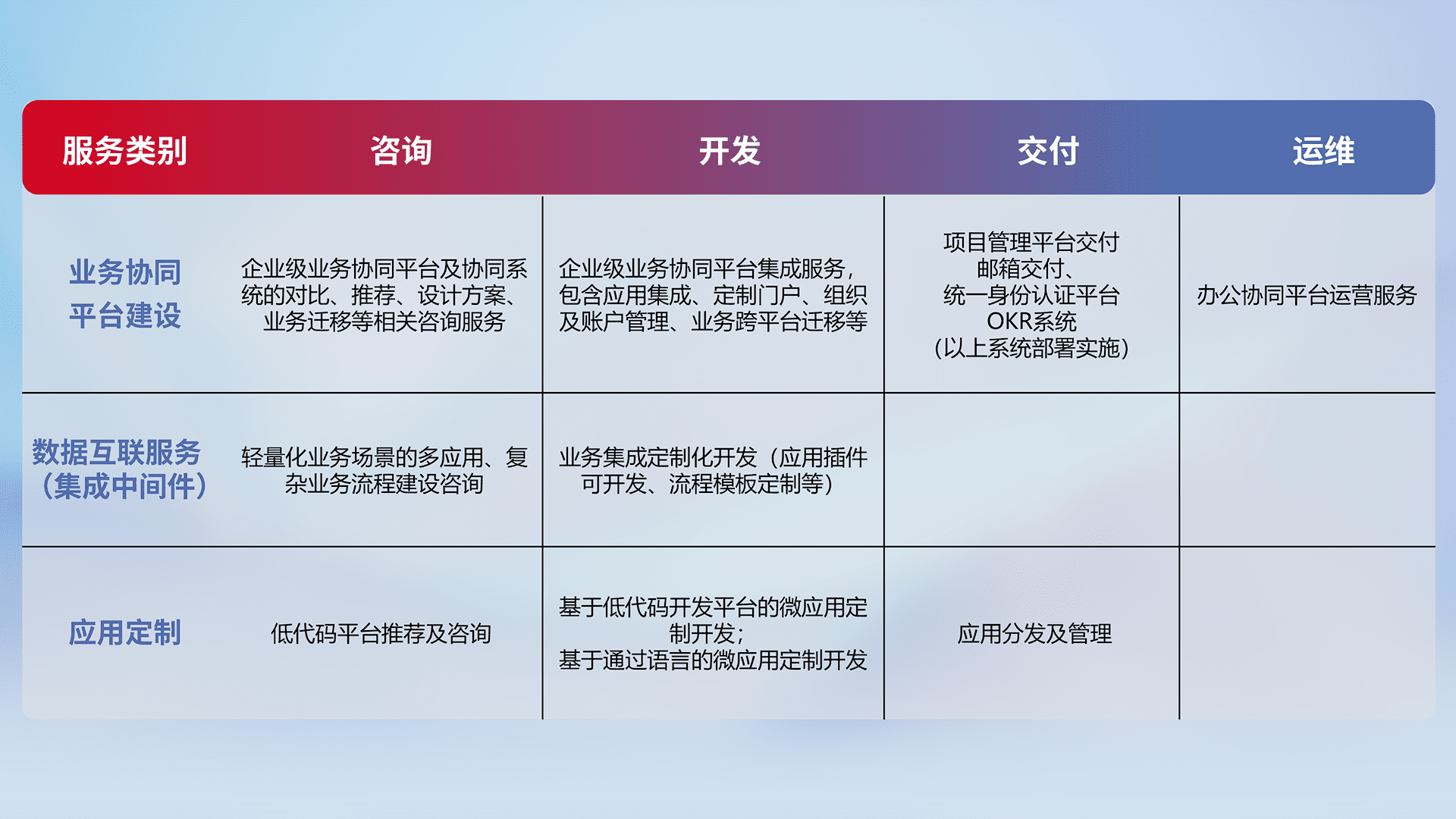 针对钉钉、、、企微、、、IDaas等平台级产品提供产品的规划、、、、方案、、、交付、、、定制化开发等服务,,,,实现如统一协同办公、、智能客户服务、、混合会议管理、、智能数据查询、、、、等业务场景,,,,实现数字化转型。。。