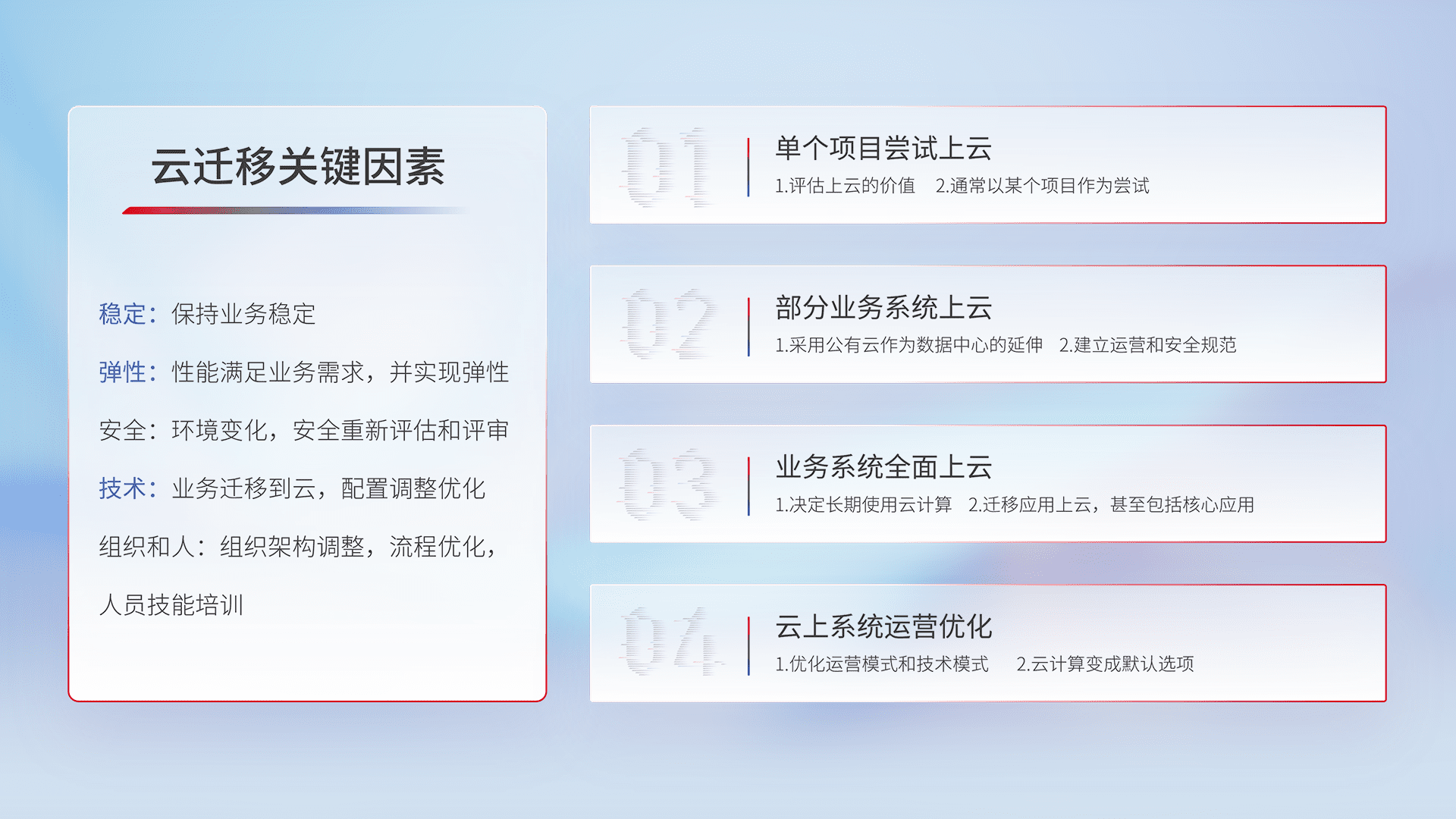 结合实际业务,,从规划设计、、、云平台选型、、、、云原生改造、、数据迁移、、、、集成交付,,,迁移全过程为客户识别最佳上云路径,,做好风险识别管理,,,,设计网络架构、、、身份权限、、、安全审计合规、、、、操作审计、、日志审计、、、监控告警策略、、多站点容灾设计等,,,,对云上基础设施进行整体规划,,,提升IT治理水平,,,,以满足弹性、、高可用、、、高性能的需求。。。。